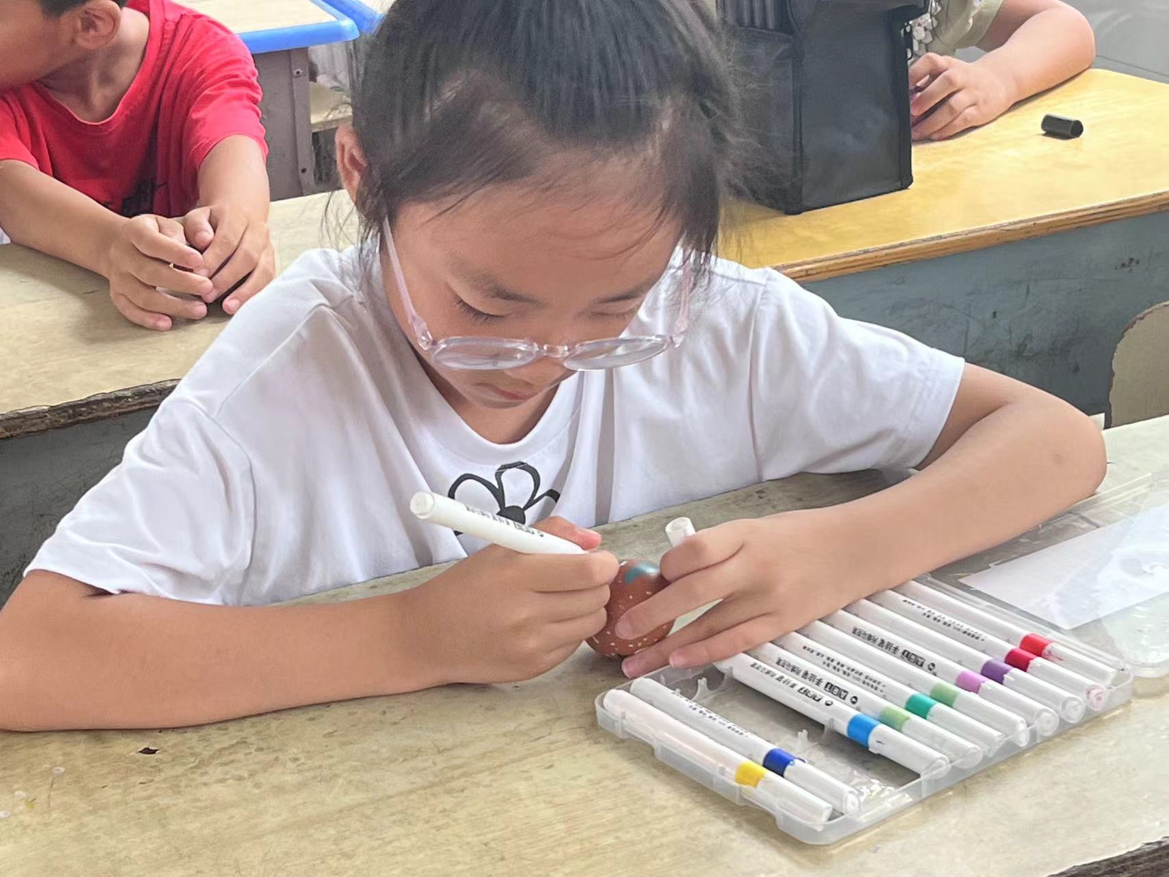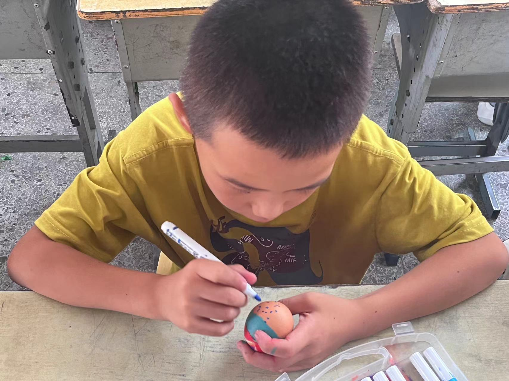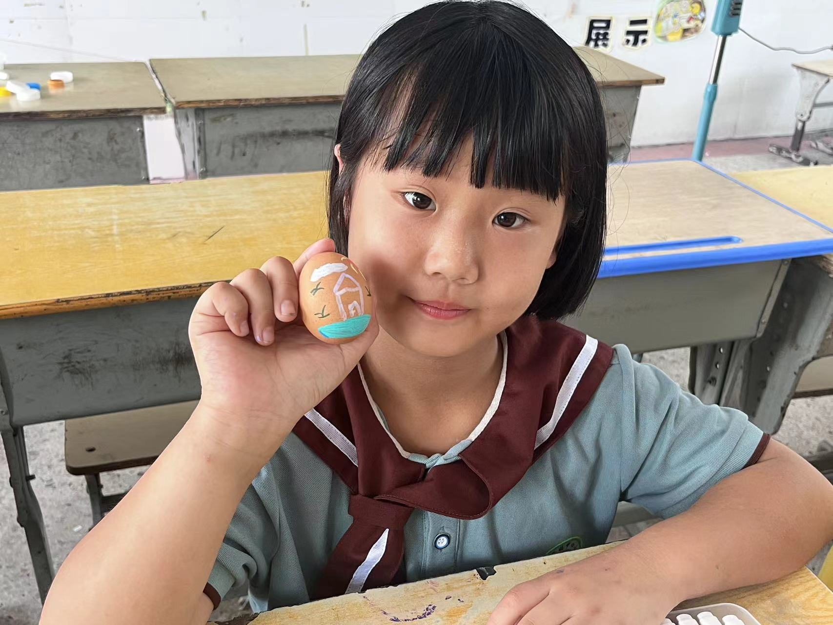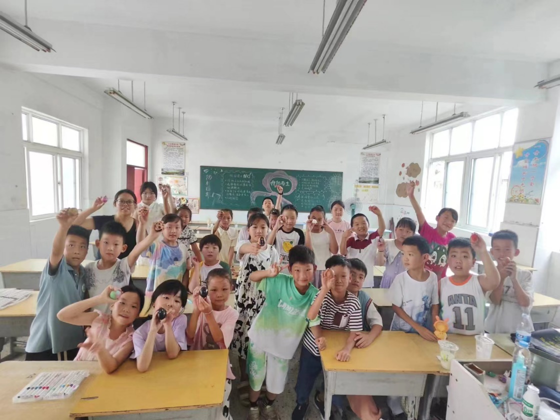 在活动中,支教团成员为每位孩子分发了一颗完整的鸡蛋,让他们自由发挥,将心中所想绘制在鸡蛋壳上,孩子们的想象力和创造力得到了充分释放。有的画上了天空中飞翔的彩虹鸟,展现出他们对自由和广阔世界的向往;有的绘制了想要保护的汪洋大海,体现了他们内心深处的美好。每一颗鸡蛋壳都成为了孩子们心灵深处的具象化,透露着他们对美好未来的期盼和勇敢追求。